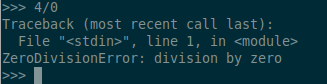When we try to divide by zero, Python replies ZeroDivisionError: division by zero